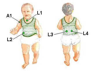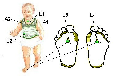 Используются четыре индуктора (рис.13). Один (L1) устанавливается в области тимуса, а другой в проекции печени (L2). Два индуктора (L3, L4) располагают на подошвенной части стопы. Информацию о состоянии иммунной системы ребенка получают, располагая датчик обратной связи в области тимуса (A1) или в области надплечья справа (A2). Время воздействия 12 минут – пять сеансов.