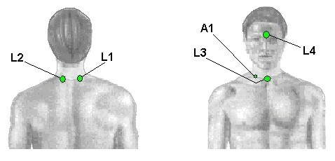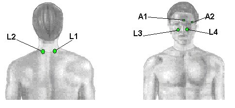 Два индуктора (L1, L2) располагаются на задней стороне шеи (паравертебрально - на уровне 6-7 сегментов шейного отдела позвоночного столба). Другие два индуктора (L3, L4) располагаются на области гайморовых пазух или в области "скатов" носа. При рините датчик обратной связи (А1) располагают в области лба на средней линии, а при гайморите - в височной области (А2) - (рис.1). Экспозиция 12 минут - 8 сеансов.