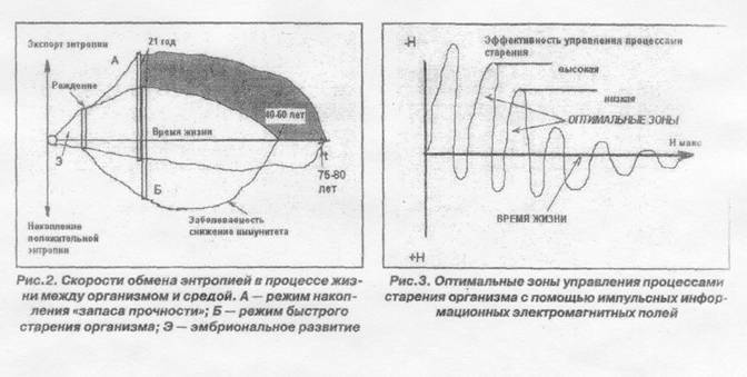 Для усиления экспорта энтропии и оптимального связывания свободной энергии предлагается использовать «фактор управления», работающий по принципу обратной биологической связи. Таким «фактором управления» может быть низкочастотное импульсное сложно модулированное электромагнитное (информационное) поле, имеющее регулируемую отрицательную энтропийную компоненту. Адекватность подобного воздействия исследована [6. 7. 8. 9]. Если эту управляемую в реальном масштабе времени, отрицательную энтропийную компоненту ввести в оптимальную зону развития организма (рис.3), то создаются реальные условия управления процессами старения организма (имеется ввиду и увеличение продолжительности жизни), позволяющие направленно по заданным критериям (законам) сдвигать обменные процессы на клеточном, тканевом, органном и соответственно функциональном функциональном уровнях.